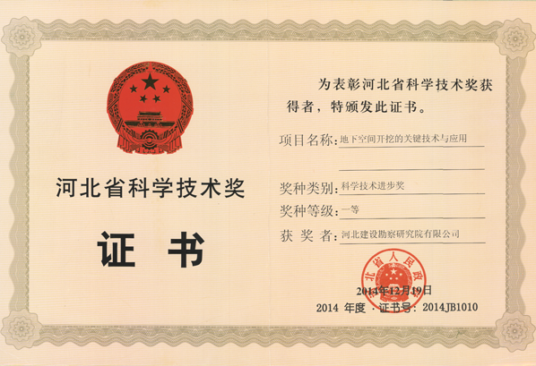 2015年2月26日,省委、省政府在石家莊召開全省科技創(chuàng)新暨科學(xué)技術(shù)獎(jiǎng)勵(lì)大會(huì),省委書記、省人大常委會(huì)主任周本順,省委副書記、省長(zhǎng)張慶偉出席會(huì)議并講話。會(huì)上,副省長(zhǎng)許寧宣讀了省政府關(guān)于2014年度河北省科學(xué)技術(shù)獎(jiǎng)勵(lì)的決定,公布了獲獎(jiǎng)項(xiàng)目(人員)名單。我公司申報(bào)的項(xiàng)目“地下空間開挖的關(guān)鍵技術(shù)與應(yīng)用”榮獲2014年度河北省科學(xué)技術(shù)進(jìn)步獎(jiǎng)一等獎(jiǎng)。