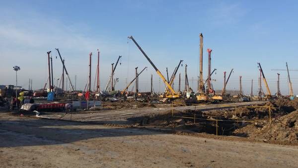 本工程主要特點(diǎn)為“短、平、快”。工期緊,任務(wù)重,施工場(chǎng)地狹小,投入機(jī)械設(shè)備和人員眾多。高峰期投入旋挖鉆機(jī)40臺(tái)、潛水鉆6臺(tái)、鏟車42臺(tái)、挖掘機(jī)7臺(tái)、吊車44臺(tái)、HZS120型攪拌站一套、35型攪拌站一套、90攪拌站一臺(tái)套、罐車31臺(tái),項(xiàng)目施工的人員達(dá)918人。由于地層條件復(fù)雜,場(chǎng)地地層較軟,現(xiàn)場(chǎng)采用灰土拌合硬化,部分區(qū)域鋪設(shè)鋼板配合施工,有效的解決了場(chǎng)地困難問題,通過精心組織,保證了工程優(yōu)質(zhì)高效實(shí)施。