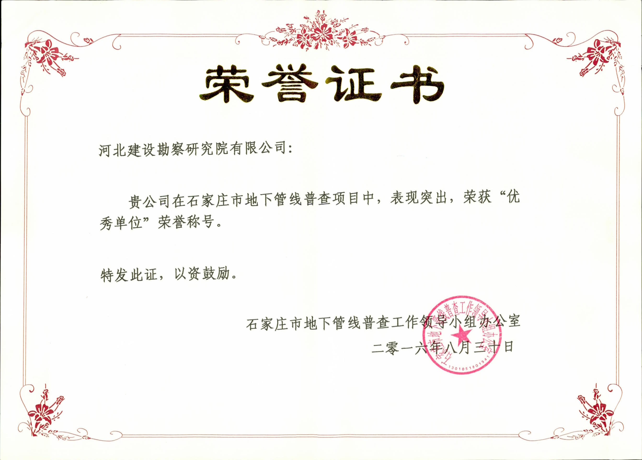 公司承擔(dān)的石家莊市地下管線普查項目于近日完工,并順利通過石家莊市地下管線普查工作領(lǐng)導(dǎo)小組檢查。石家莊市地下管線普查工作領(lǐng)導(dǎo)小組充分肯定了我公司在該項目中取得的成績和突出的表現(xiàn),特頒發(fā)“優(yōu)秀單位”榮譽證書,以資鼓勵。