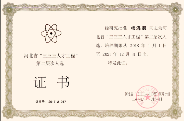 經(jīng)公司推薦,河北省人力資源和社會(huì)保障廳組織評(píng)審,河北省“三三三人才工程”領(lǐng)導(dǎo)小組批準(zhǔn)、公司楊海朋榮獲河北省“三三三人才工程”第二層次人選。