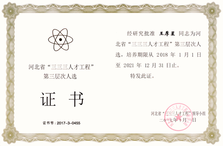 經(jīng)公司推薦,石家莊市人力資源和社會(huì)保障局組織評(píng)審,報(bào)請(qǐng)河北省“三三三人才工程”領(lǐng)導(dǎo)小組備案,公司王厚星榮獲河北省“三三三人才工程”第三層次人選。