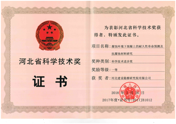 5月30日上午,河北省科學技術獎勵暨慶祝“全國科技工作者日”大會在石家莊舉行。省委書記王東峰、省長許勤等省領導出席大會,并為榮獲2017年度河北省科學技術獎勵代表和第十屆河北省優(yōu)秀科技工作者代表頒發(fā)證書。我公司《腐蝕環(huán)境下混凝土的耐久性壽命預測及抗腐蝕材料研究》獲省科技進步一等獎、《素混凝土剛性樁復合地基核心技術研究與工程應用》獲三等獎,聶慶科總工程師代表公司參加了大會并上臺領獎。這是我公司繼2014、2015年度后再獲河北省科技進步一等獎,對我們既是極大鼓舞和肯定,也必將激勵和鞭策廣大專業(yè)技術人員,以黨的十九大精神和習總書記在兩院院士大會講話精神為指引,積極投身創(chuàng)新實踐,大力開展科研攻關,為不斷推進巖土工程技術發(fā)展、提升企業(yè)創(chuàng)新能力和核心競爭力而繼續(xù)努力奮斗。