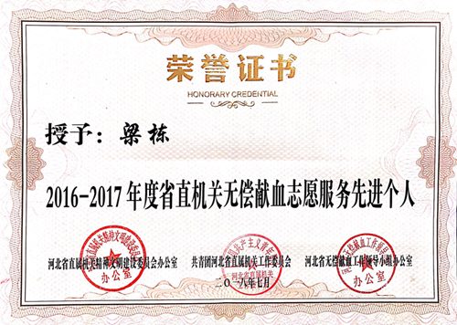 經(jīng)我公司團(tuán)委及省住建廳直屬機(jī)關(guān)團(tuán)委共同推薦,梁棟同志被河北省直屬機(jī)關(guān)精神文明委員會(huì)辦公室、共青團(tuán)河北省直屬機(jī)關(guān)工作委員會(huì)、河北省無償獻(xiàn)血工作領(lǐng)導(dǎo)小組辦公室授予無償獻(xiàn)血志愿服務(wù)先進(jìn)個(gè)人榮譽(yù)稱號(hào)。