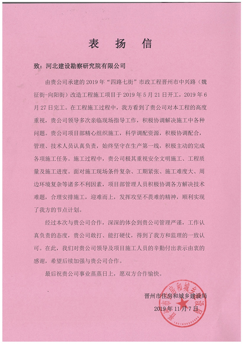 我公司承建的2019年“四路七街”市政工程晉州市中興路(魏征街-向陽(yáng)街)改造工程,在施工過程中,項(xiàng)目部精心組織策劃,科學(xué)調(diào)配資源,主動(dòng)認(rèn)真負(fù)責(zé),始終堅(jiān)守在生產(chǎn)第一線,確保了工期、質(zhì)量、安全,順利實(shí)現(xiàn)了業(yè)主的節(jié)點(diǎn)計(jì)劃,得到了業(yè)主和監(jiān)理的一致認(rèn)可,為晉州的后續(xù)市場(chǎng)開拓出了新局面。