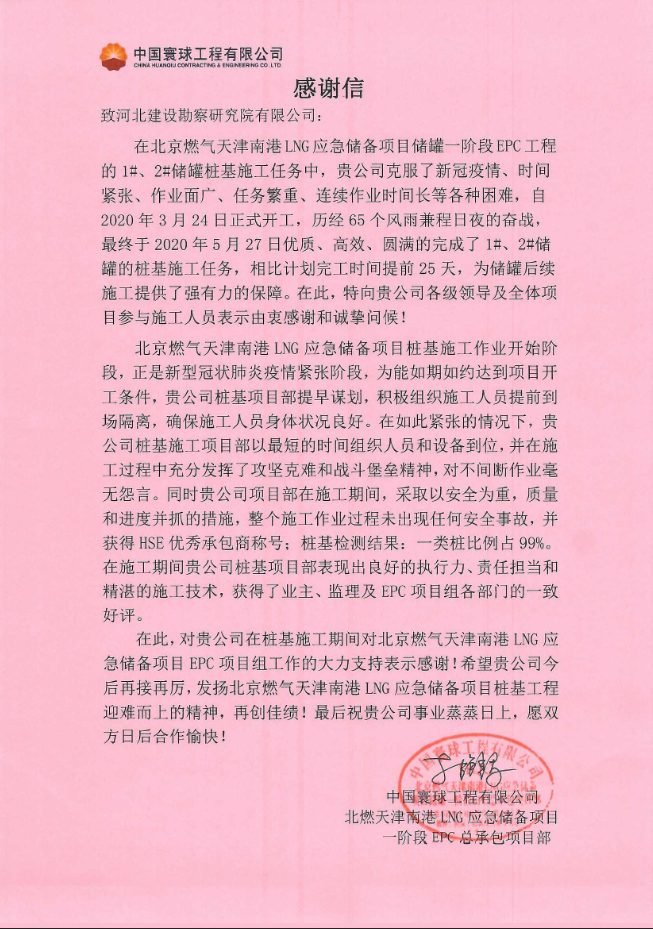 由我公司承建的北京燃氣天津南港LNG應急儲備項目1#、2#儲罐樁基工程,自2020年3月24日正式開工,歷經(jīng)65個日夜的奮戰(zhàn),最終于2020年5月27日優(yōu)質(zhì)、高效、圓滿的完成了1#、2#儲罐的樁基施工任務。中國寰球工程有限公司北京燃氣天津南港LNG應急儲備項目儲罐一階段EPC項目組,對我公司北燃樁基項目組表示由衷的感謝,感謝我公司領(lǐng)導及全體項目施工人員的辛勤付出,在克服了新冠疫情、時間緊張、作業(yè)面廣、任務繁重、連續(xù)作業(yè)時間長等各種困難的情況下,奮勇向前,較原定工期提前25天完成施工任務,為項目后續(xù)施工帶來了強有力的工期保障。同時對我公司在樁基施工期間對北京燃氣天津南港LNG應急儲備項目EPC項目組工作的大力支持表示感謝!希望我公司今后再接再厲,繼續(xù)發(fā)揚迎難而上的精神,再創(chuàng)佳績!