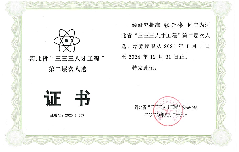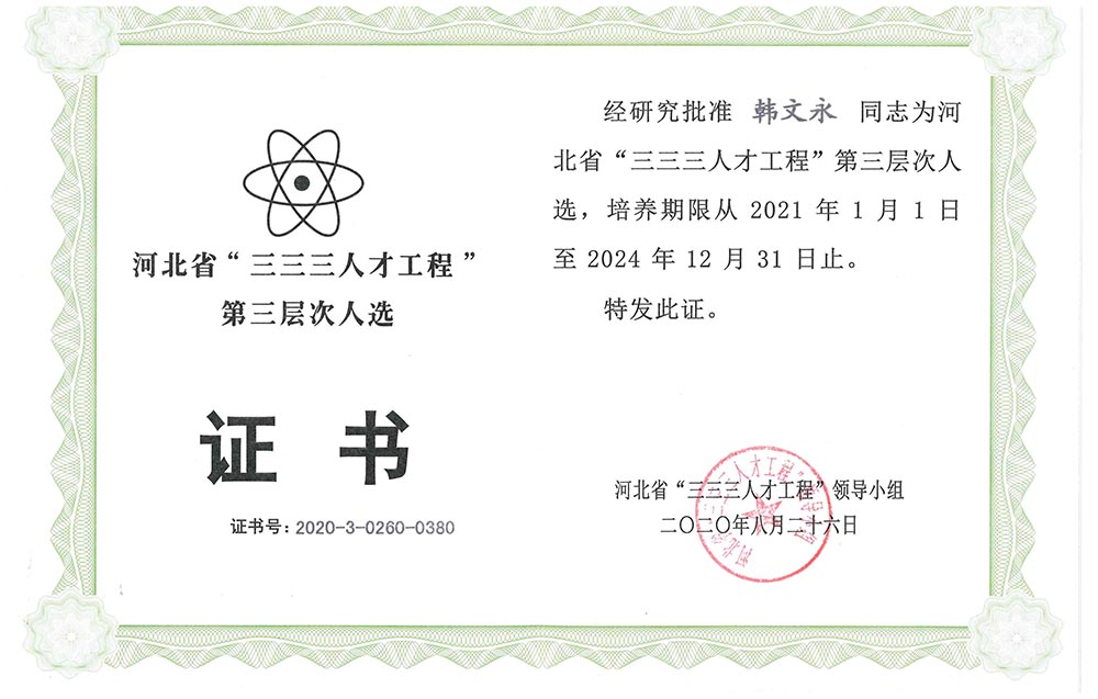 經(jīng)公司申報、石家莊市人力資源和社會保障局推薦,河北省“三三三人才工程”領(lǐng)導(dǎo)小組批準,公司張開偉同志榮獲2020年度河北省“三三三人才工程”第二層次人選,韓文永、孫廣兩名同志榮獲2020年度河北省“三三三人才工程”第三層次人選。