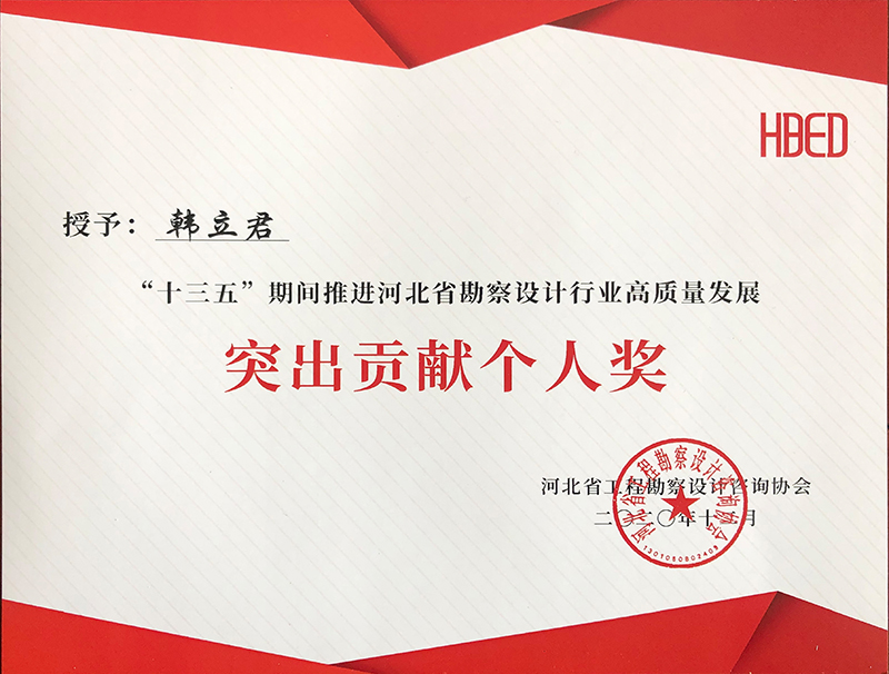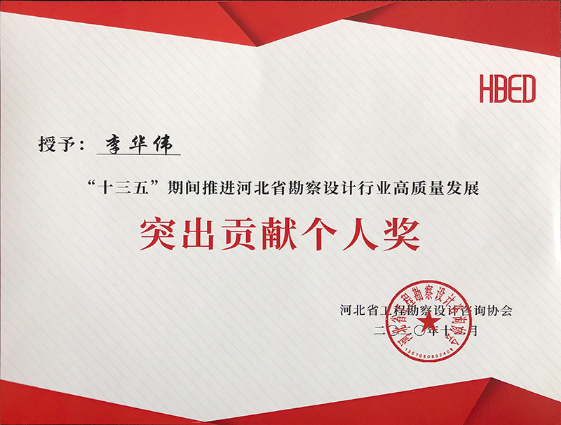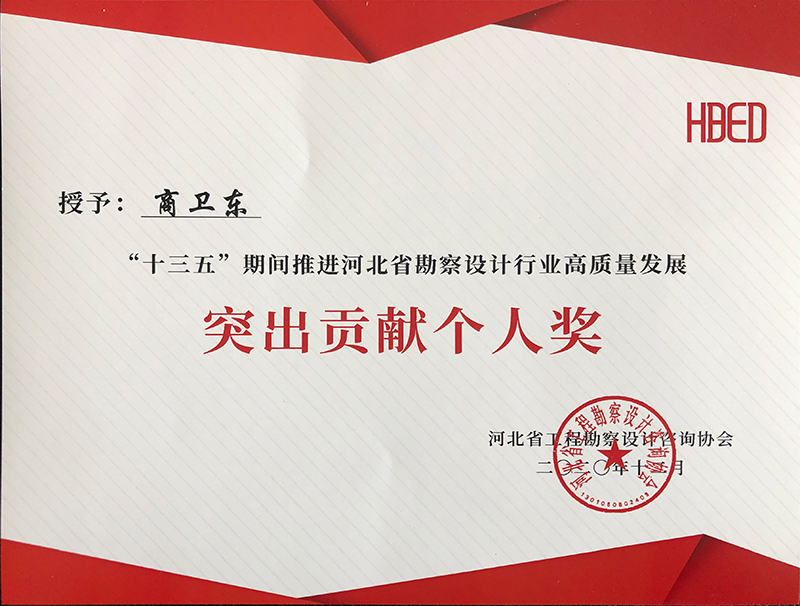 由河北省工程勘察設(shè)計咨詢協(xié)會評選,公司榮獲“十三五”期間推進河北省勘察設(shè)計行業(yè)高質(zhì)量發(fā)展突出貢獻單位,韓立君董事長、李華偉總經(jīng)理、商衛(wèi)東主任榮獲“十三五”期間“推進河北省勘察設(shè)計行業(yè)高質(zhì)量發(fā)展突出貢獻個人”。