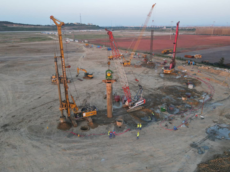 中海油龍口南山LNG接收站一期工程項目(以下簡稱“龍口LNG”)站址位于山東省龍口市煙臺港龍口港區(qū)作業(yè)區(qū)規(guī)劃LNG專區(qū),本工程于2020年4月15日開工,2021年4月1日竣工,歷時351天。完成的主要工作量為T-0201、T-0202儲罐樁基工程相關(guān)的全部工作,包含:泥漿護(hù)壁成孔一體化灌注樁(樁數(shù)720根,直徑1.5m,樁長為9.86m~41.8m不等,混凝土等級C40P8)40765.71m³、鋼筋籠3564.846t、入巖增加費10892.03m³、聲測管(SCG50-1)8601.59m、碎石樁(樁徑1m,樁長8m,樁數(shù)3497根)21972.3m³、旋挖棄土外運39358.86m³、預(yù)留隔震墊安裝孔洞(單樁孔洞數(shù)量10個,孔洞長度0.9m,孔徑80mm)720套,超前鉆5247.5m。