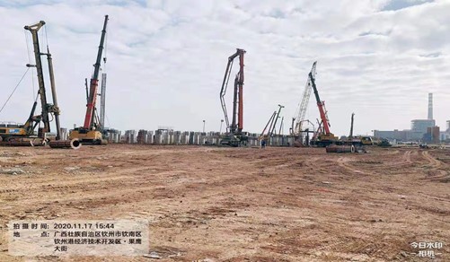 本工程位于廣西欽州港。受廣西華誼新材料有限公司委托,我公司承擔(dān)本項(xiàng)目樁基施工。采用自有的“樁柱一體”施工工法、長臂挖掘機(jī)振動下設(shè)長護(hù)筒、標(biāo)準(zhǔn)化泥漿池、快速機(jī)械連接、旋挖鉆機(jī)入巖等施工工藝和新方法共計(jì)完成4093根灌注樁,PHC管樁1759根。