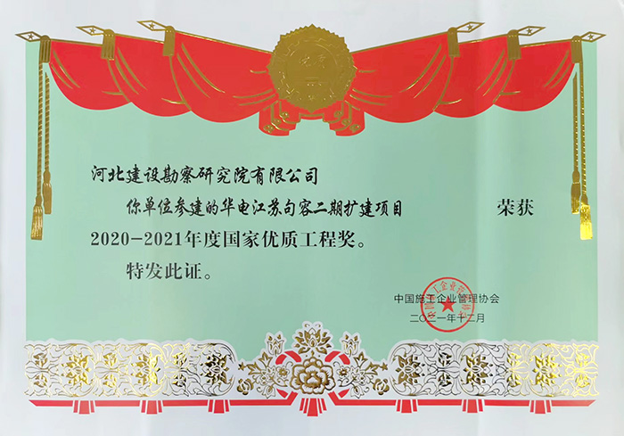 我公司參建的華電江蘇句容二期擴建項目榮獲2020—2021年度國家優(yōu)質(zhì)工程獎。