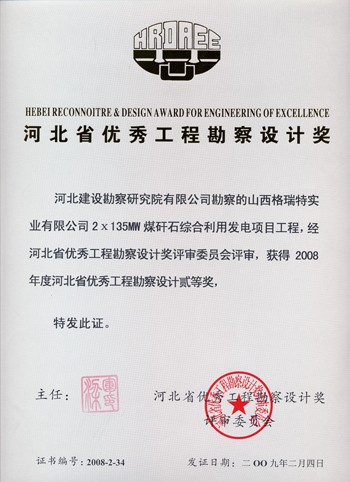 山西格瑞特實(shí)業(yè)有限公司2×135MW煤矸石綜合利用發(fā)電項(xiàng)目獲河北省優(yōu)秀工程勘察設(shè)計(jì)二等獎(jiǎng)。
