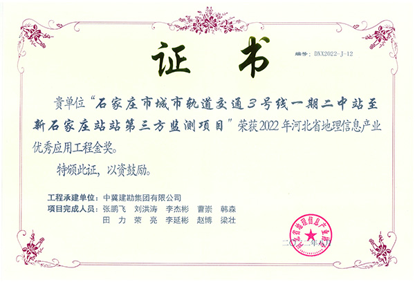 近日,由河北省地理信息產(chǎn)業(yè)協(xié)會(huì)評(píng)選,公司榮獲2020-2021年度河北省地理信息產(chǎn)業(yè)甲級(jí)測(cè)繪資質(zhì)“十佳單位”榮譽(yù)稱號(hào),赫英超同志榮獲河北省地理信息產(chǎn)業(yè)“優(yōu)秀青年管理人才”稱號(hào);同時(shí)石家莊市城市軌道交通3號(hào)線一期二中站至新石家莊站站第三方監(jiān)測(cè)項(xiàng)目榮獲“2022年度河北省地理信息產(chǎn)業(yè)優(yōu)秀應(yīng)用工程金獎(jiǎng)”。