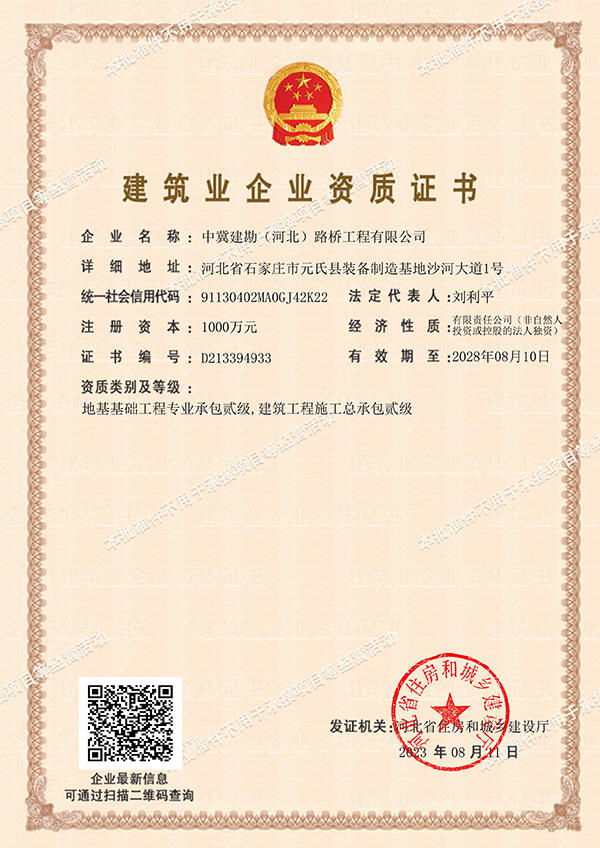 中冀建勘(河北)路橋工程有限公司取得建筑工程施工總承包貳級、地基基礎(chǔ)工程專業(yè)承包貳級資質(zhì)證書