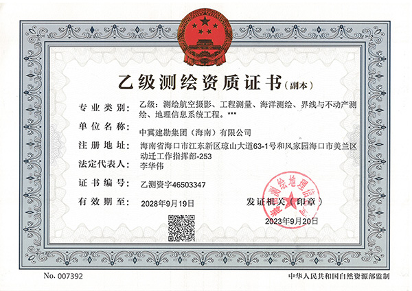 在集團(tuán)公司領(lǐng)導(dǎo)的正確領(lǐng)導(dǎo)下,經(jīng)過工程測量公司和安全生產(chǎn)部的精心運(yùn)作,中冀建勘集團(tuán)(海南)有限公司于2023年9月20日取得了海南測繪地理信息局頒發(fā)的測繪乙級資質(zhì),資質(zhì)包含五個專業(yè):測繪航空攝影、工程測量、海洋測繪、界線與不動產(chǎn)測繪、地理信息系統(tǒng)工程。