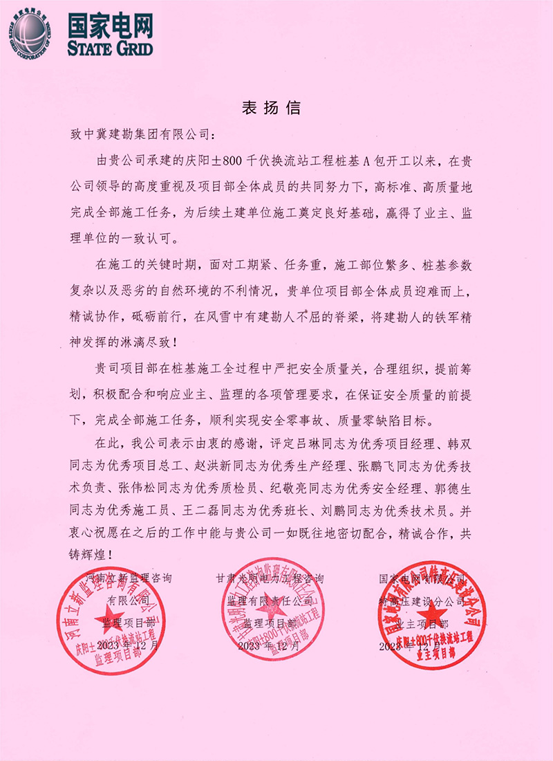 公司收到了國(guó)家電網(wǎng)慶陽(yáng)±800千伏換流站工程由業(yè)主國(guó)家電網(wǎng)和監(jiān)理單位河南立新及甘肅光明的聯(lián)合表?yè)P(yáng)信,表?yè)P(yáng)信中說(shuō)在我公司領(lǐng)導(dǎo)的高度重視及項(xiàng)目部全體成員的共同努力下,高標(biāo)準(zhǔn)、高質(zhì)量地完成施工任務(wù),為后續(xù)土建單位施工奠定良好基礎(chǔ),贏得了業(yè)主、監(jiān)理單位的一致認(rèn)可。在施工的關(guān)鍵時(shí)期,我單位項(xiàng)目部全體成員迎難而上,精誠(chéng)協(xié)作,砥礪前行,在風(fēng)雪中有建勘人不屈的脊梁,將建勘人的鐵軍精神發(fā)揮的淋漓盡致!