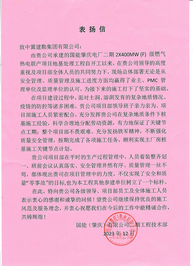 國(guó)能肇慶電廠二期2×400MW(F)級(jí)燃?xì)鉄犭娐?lián)產(chǎn)項(xiàng)目為二期擴(kuò)建工程,在總公司及領(lǐng)導(dǎo)們的幫助下攻堅(jiān)克難,面對(duì)土洞、溶洞發(fā)育的復(fù)雜地質(zhì)情況、疫情的防控等諸多困難,充分發(fā)揚(yáng)鐵軍精神,不斷強(qiáng)化質(zhì)量安全管理,積極配合業(yè)主進(jìn)度計(jì)劃,按期完成了各項(xiàng)施工任務(wù)。我單位在安全管理、施工質(zhì)量管理方面為建設(shè)方、PMC管理單位、監(jiān)理方留下深刻影響,為此項(xiàng)目部得到了國(guó)能(肇慶)熱電有限公司的高度認(rèn)可!