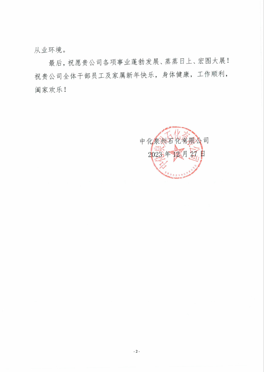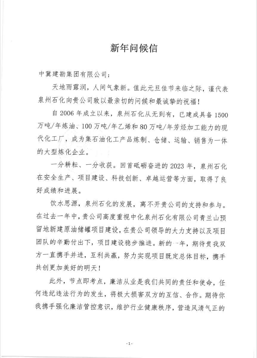 中化泉州石化有限公司為我公司發(fā)來(lái)了新年問(wèn)候信,信中中化泉州石化有限公司肯定了我公司對(duì)中化泉州石化有限公司青蘭山預(yù)留地新建原油儲(chǔ)罐項(xiàng)目建設(shè)的重視;看到了我公司及項(xiàng)目施工人員為項(xiàng)目的辛勤付出;并期望在新的一年里加強(qiáng)合作,再創(chuàng)新業(yè)績(jī)。