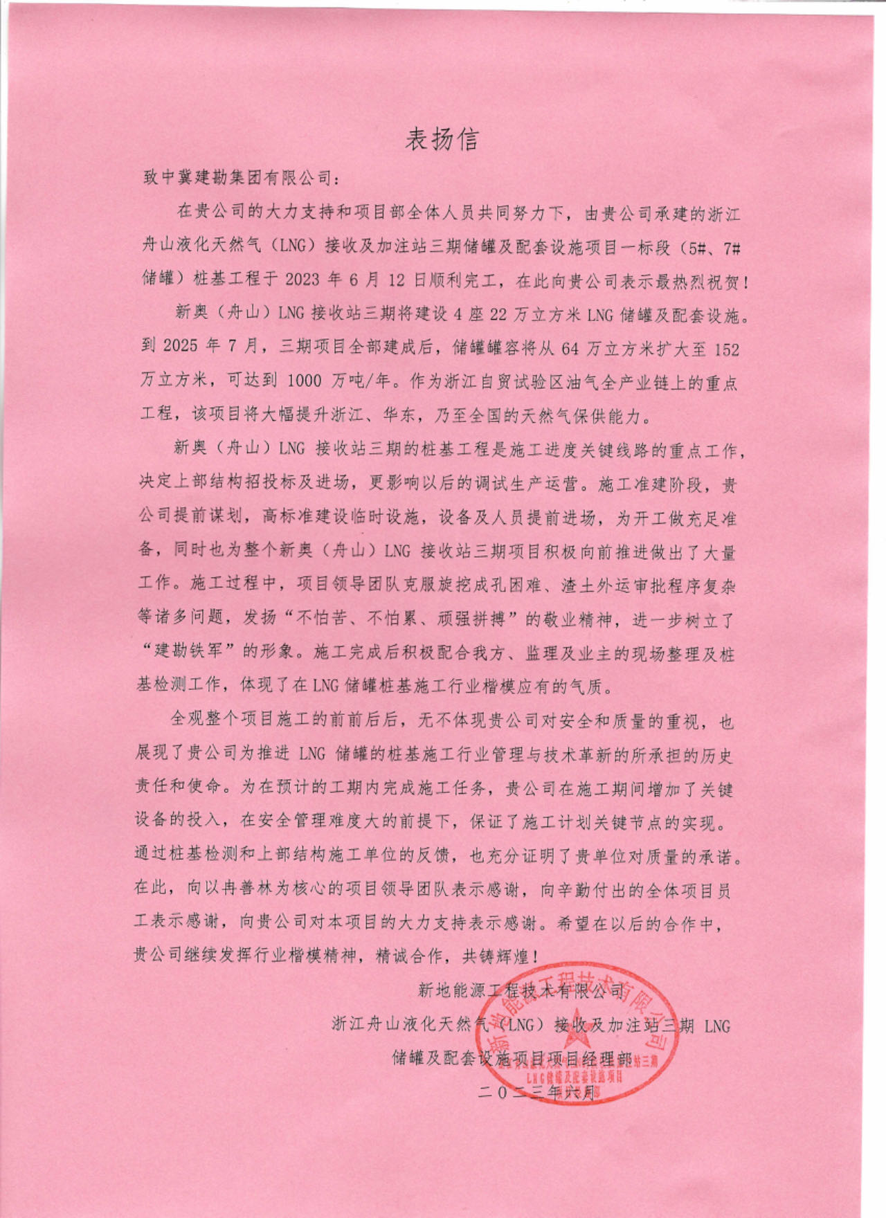 浙江舟山液化天然氣(LNG)接收及加注站三期LNG儲(chǔ)罐及配套設(shè)施項(xiàng)目(5#、7#儲(chǔ)罐樁基工程)于2023年6月25日收到新地能源工程技術(shù)有限公司發(fā)來(lái)的表?yè)P(yáng)信。自開(kāi)工以來(lái),在公司的大力支持和項(xiàng)目部全體員工的共同努力下,精心組織、全力布局,克服了前期施工任務(wù)重等諸多困難,安全、高效、優(yōu)質(zhì)的完成了儲(chǔ)罐的樁基施工任務(wù),有力保障了本項(xiàng)目總體工期計(jì)劃,贏得了監(jiān)理單位和業(yè)主單位的一致認(rèn)可和好評(píng)。