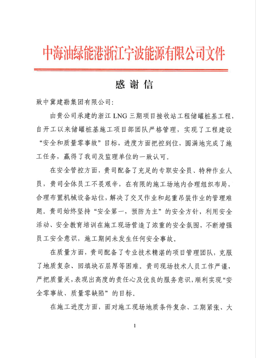 浙江LNG三期接收站儲(chǔ)罐項(xiàng)目是國(guó)家和省重點(diǎn)能源項(xiàng)目,工期、質(zhì)量、安全標(biāo)準(zhǔn)要求高,開(kāi)工前期準(zhǔn)備工作多,在集團(tuán)公司及各級(jí)領(lǐng)導(dǎo)的幫助下,項(xiàng)目部全體員工迎難而上,團(tuán)結(jié)協(xié)作,精心組織,于2023年3月4日儲(chǔ)罐樁基正式開(kāi)工,并于2023年6月18日完工。施工期間多次收到中海油綠能港浙江寧波能源有限公司頒發(fā)的各種優(yōu)秀獎(jiǎng)項(xiàng),也得到了業(yè)主方的高度認(rèn)可,也為我公司后續(xù)在承接中海油工程施工奠定了良好的基礎(chǔ)。