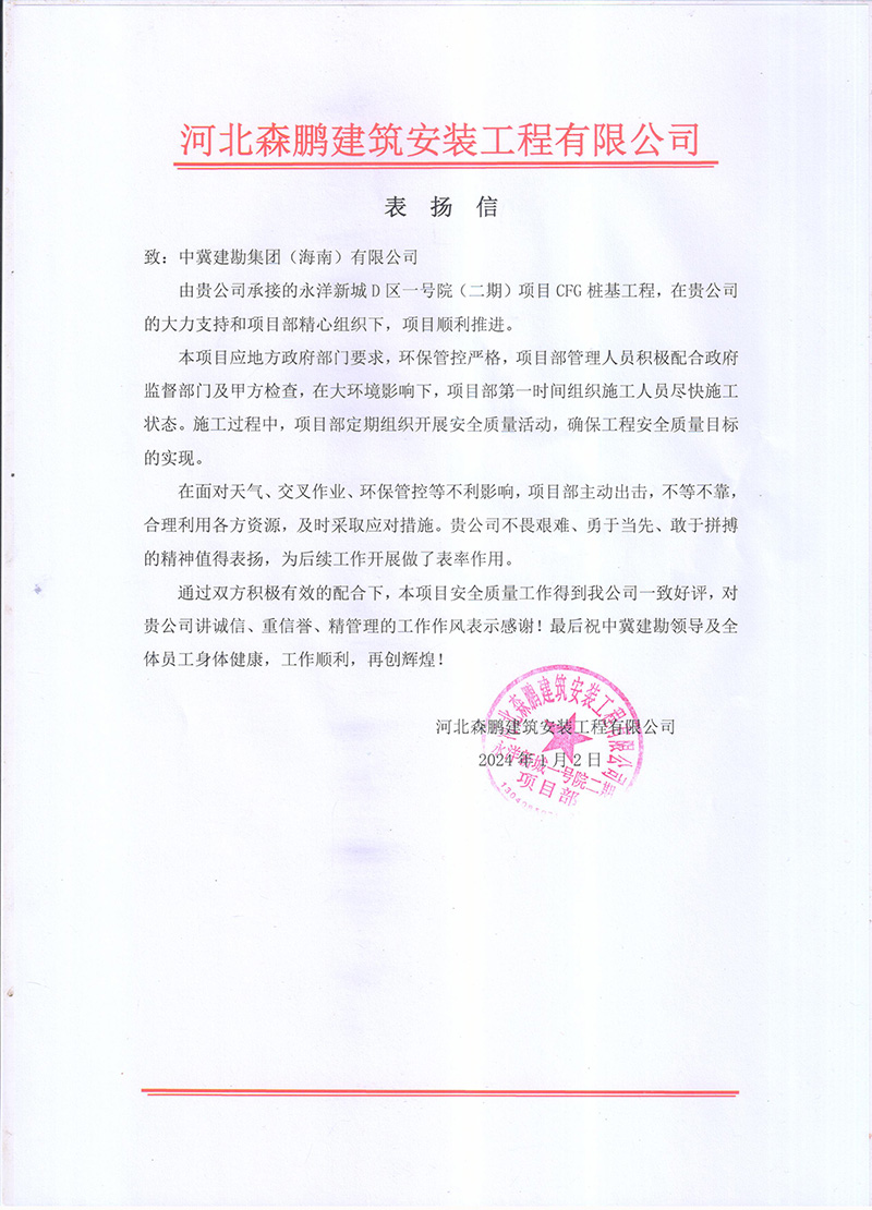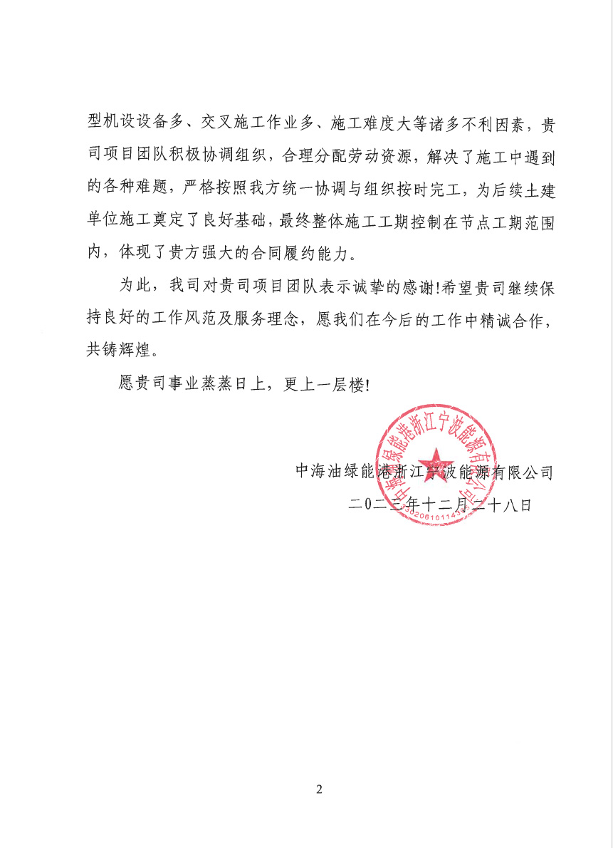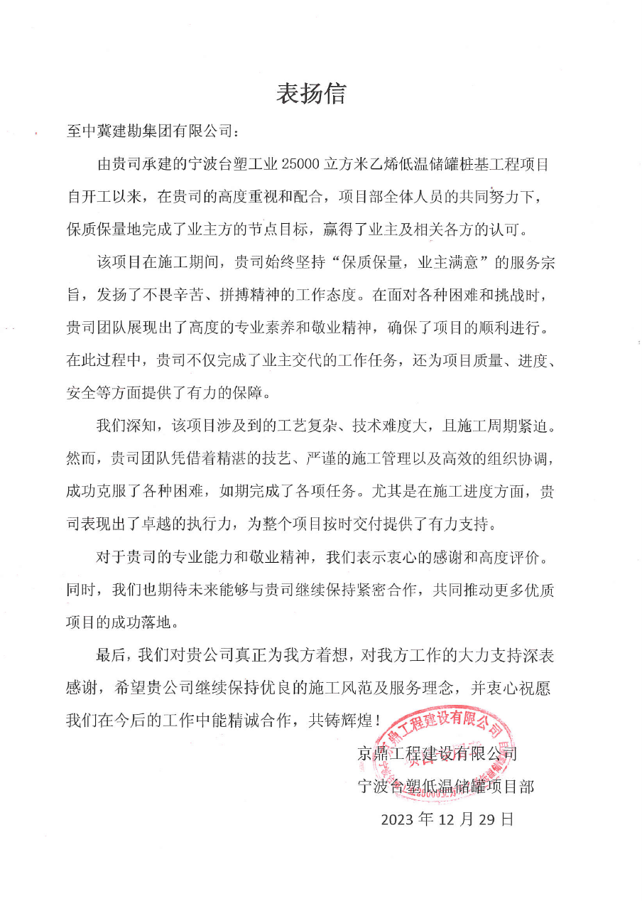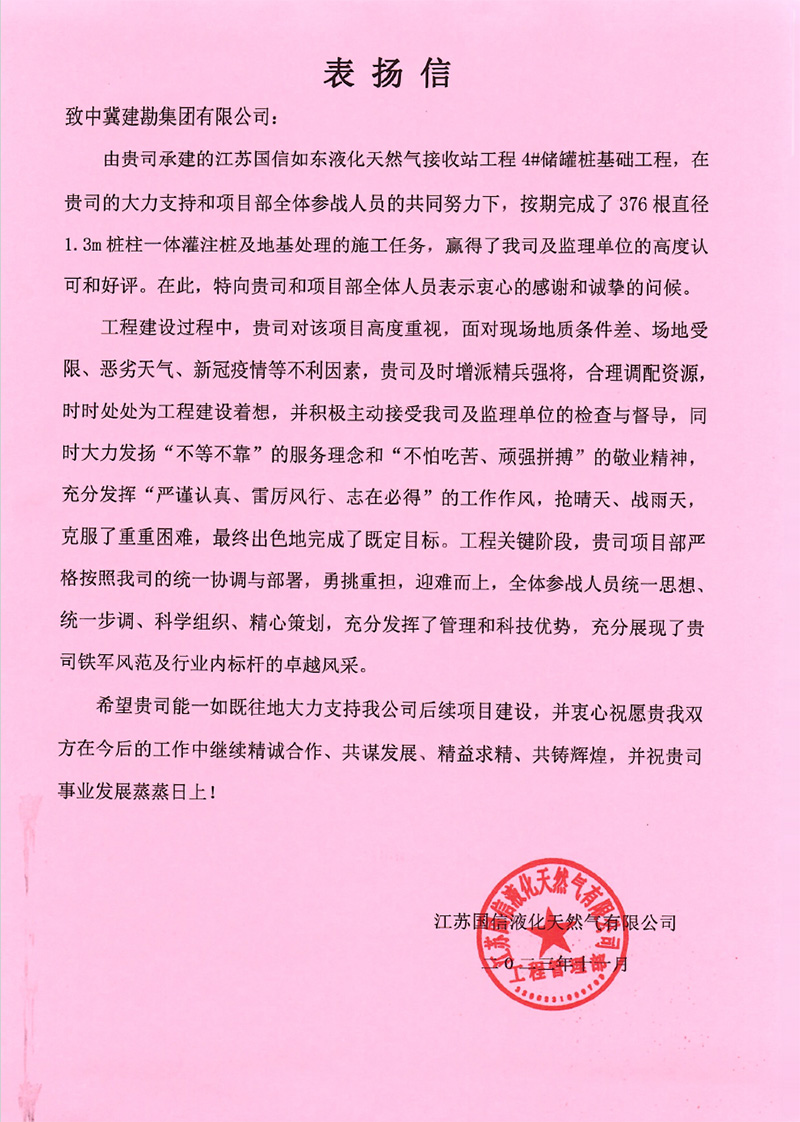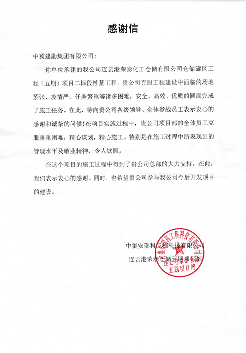 連云港榮泰化工倉(cāng)儲(chǔ)有限公司倉(cāng)儲(chǔ)罐區(qū)工程(五期)項(xiàng)目二標(biāo)段樁基工程,業(yè)主在表?yè)P(yáng)信中說(shuō):貴公司克服工程建設(shè)中面臨的場(chǎng)地緊張、疫情嚴(yán)、任務(wù)繁重等諸多困難,安全、高效、優(yōu)質(zhì)的圓滿完成了施工任務(wù)。貴公司項(xiàng)目部全體員工克服重重困難,精心謀劃,精心施工。特別是在施工中所表現(xiàn)出的管理水平及敬業(yè)精神,令人欽佩。