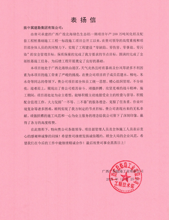 廣西北海氧化鋁項(xiàng)目樁基工程工程自2023年2月24日開(kāi)工,至12月15日完成合同內(nèi)全部樁基施工任務(wù),在此期間,項(xiàng)目部全體成員一直堅(jiān)持安全第一的理念,實(shí)現(xiàn)了工程建設(shè)“零缺陷、零傷害、零事故、零污染”的安全管理目標(biāo),施工過(guò)程中克服種種困難,順利實(shí)現(xiàn)了業(yè)主方制定的節(jié)點(diǎn)目標(biāo),獲得業(yè)主單位的肯定與褒獎(jiǎng),送出表?yè)P(yáng)信,為主要管理人員頒發(fā)獎(jiǎng)狀。為后續(xù)施工工作的開(kāi)展提供了可靠保障,贏得了業(yè)主及相關(guān)各方的認(rèn)可。