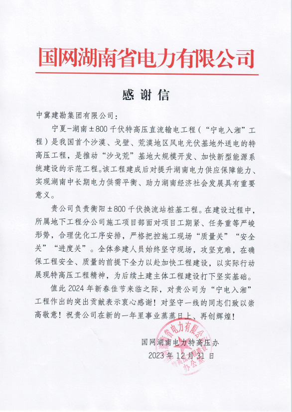 國(guó)家電網(wǎng)湖南電力特高壓辦,為我公司承建的衡陽(yáng)±800千伏換流站工程樁基項(xiàng)目部發(fā)來(lái)感謝信一封。感謝信內(nèi)容主要表達(dá)了,面對(duì)項(xiàng)目的工期緊,任務(wù)重等關(guān)鍵形勢(shì),稱贊我公司能嚴(yán)格把質(zhì)量關(guān),安全關(guān)和進(jìn)度關(guān)。