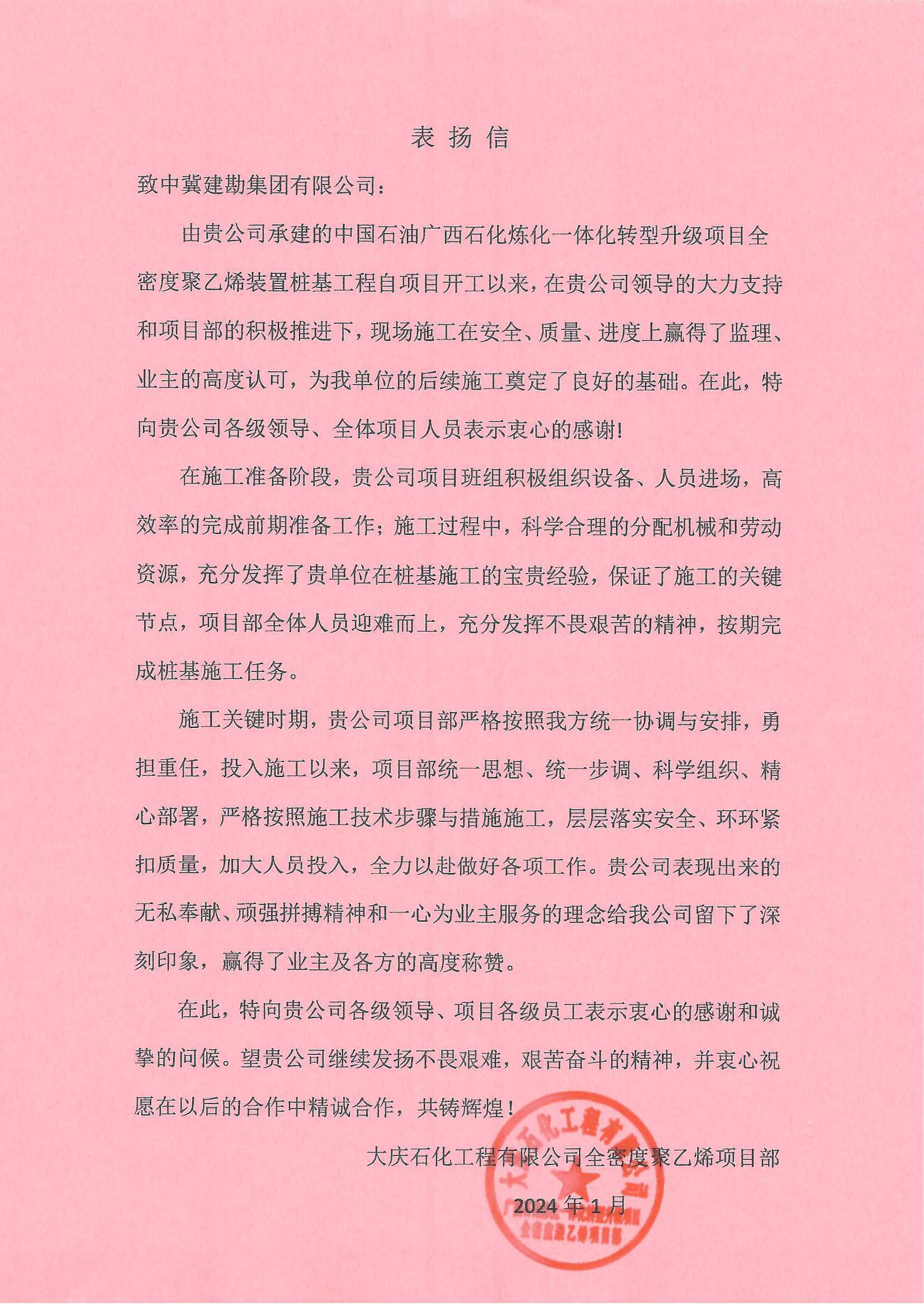 廣西石化煉化項(xiàng)目部接收到大慶石化工程有限公司全密度聚乙烯工程建設(shè)部項(xiàng)目經(jīng)理牛家偉發(fā)來(lái)的表?yè)P(yáng)信,信中肯定了我項(xiàng)目部在廣西石化煉化項(xiàng)目樁基工程中所取得的成果。