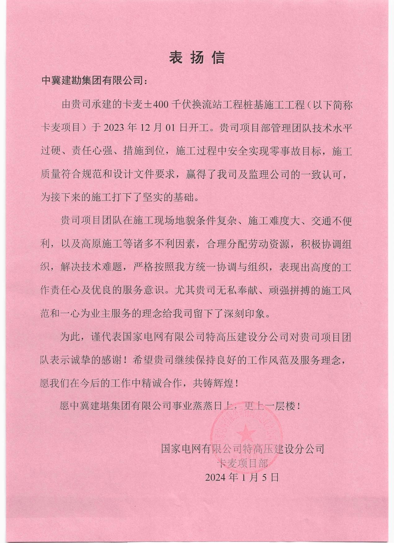 卡麥±400千伏換流站工程樁基施工工程收到業(yè)主國(guó)家電網(wǎng)有限公司特高壓建設(shè)分公司發(fā)來(lái)的表?yè)P(yáng)信。項(xiàng)目部敢打硬仗的精神面貌,贏得了業(yè)主方的高度贊賞和認(rèn)可。