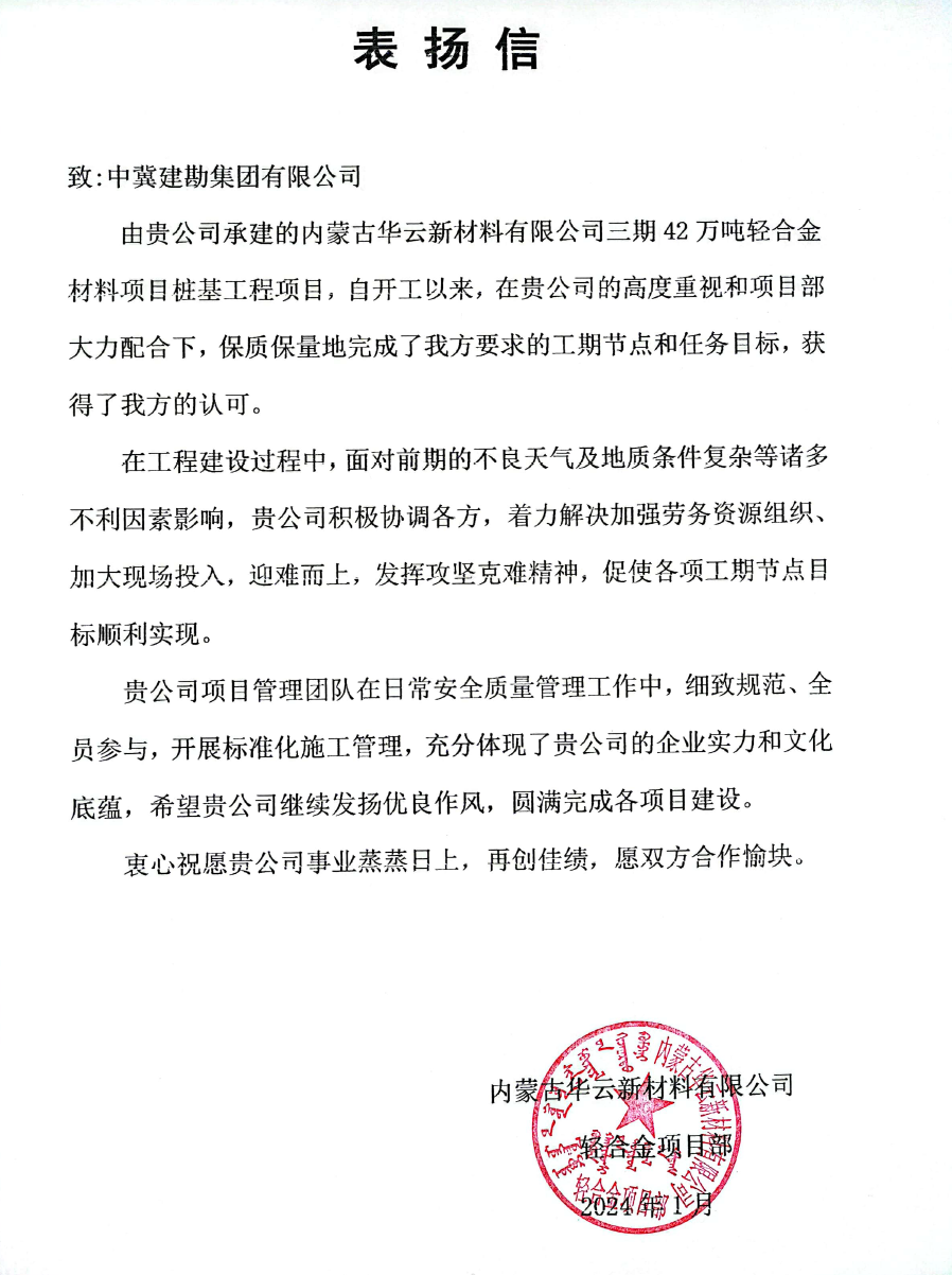 內(nèi)蒙古華云新材料有限公司三期42萬(wàn)噸輕合金材料項(xiàng)目樁基工程,在工程建設(shè)過(guò)程中,面對(duì)前期的不良天氣及地質(zhì)條件復(fù)雜等諸多不利因素影響,積極協(xié)調(diào)各方,著力解決加強(qiáng)勞務(wù)資源組織、加大現(xiàn)場(chǎng)投入,迎難而上,發(fā)揮攻堅(jiān)克難精神,保質(zhì)保量地完成了工期節(jié)點(diǎn)和任務(wù)目標(biāo),獲得甲方的認(rèn)可。