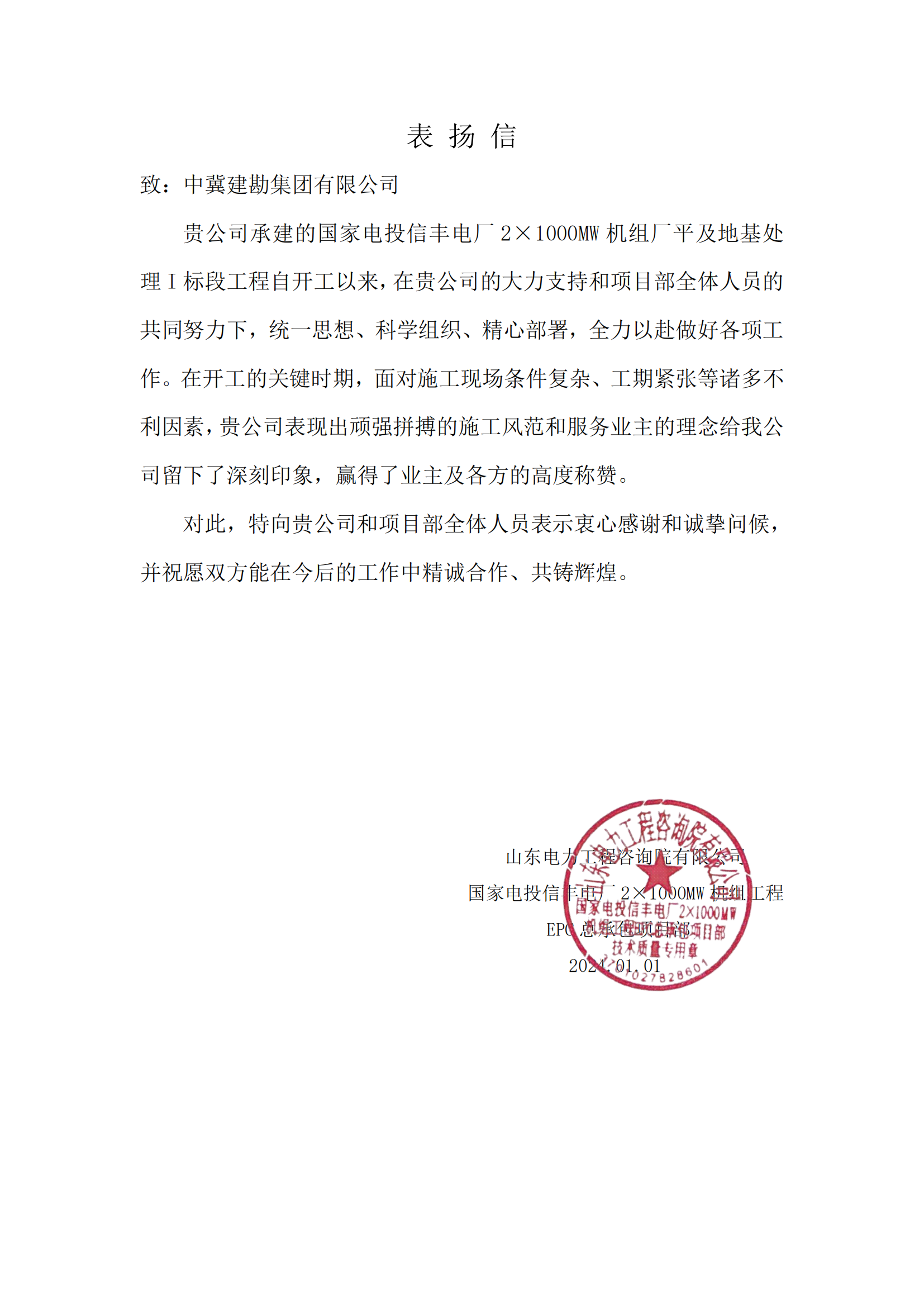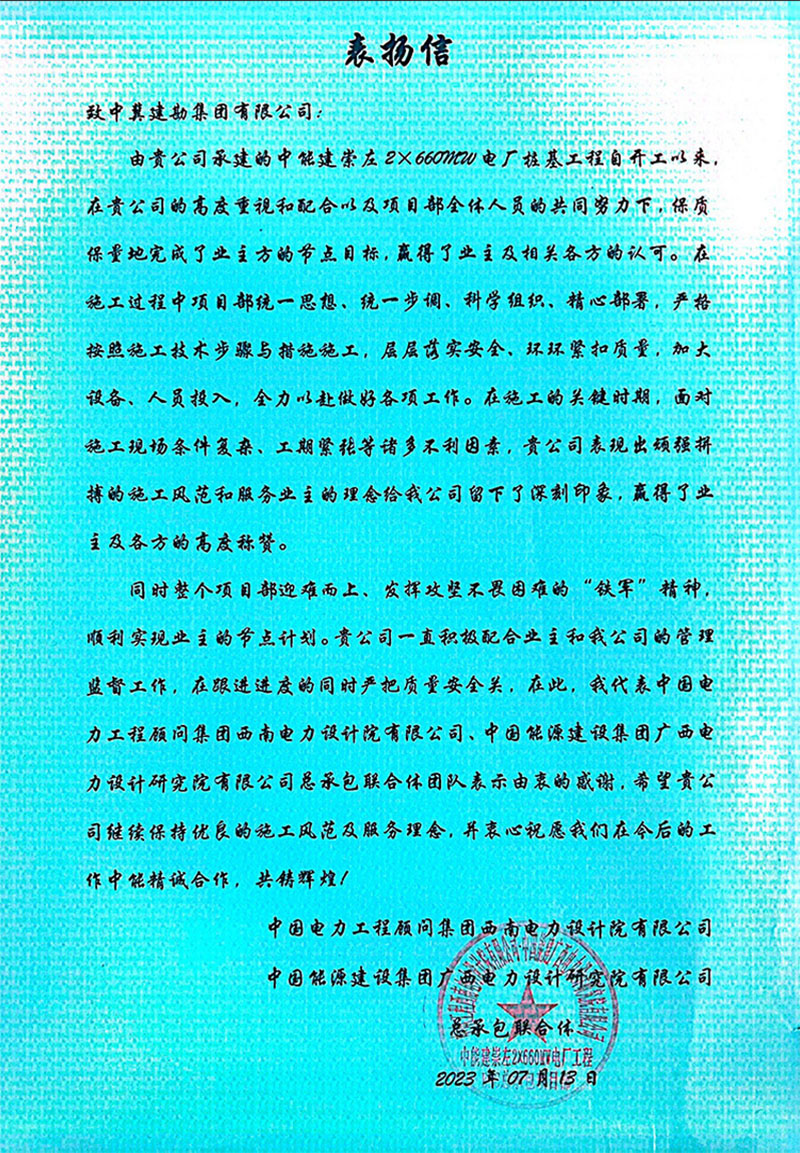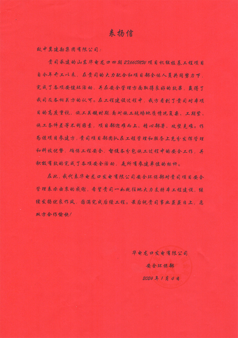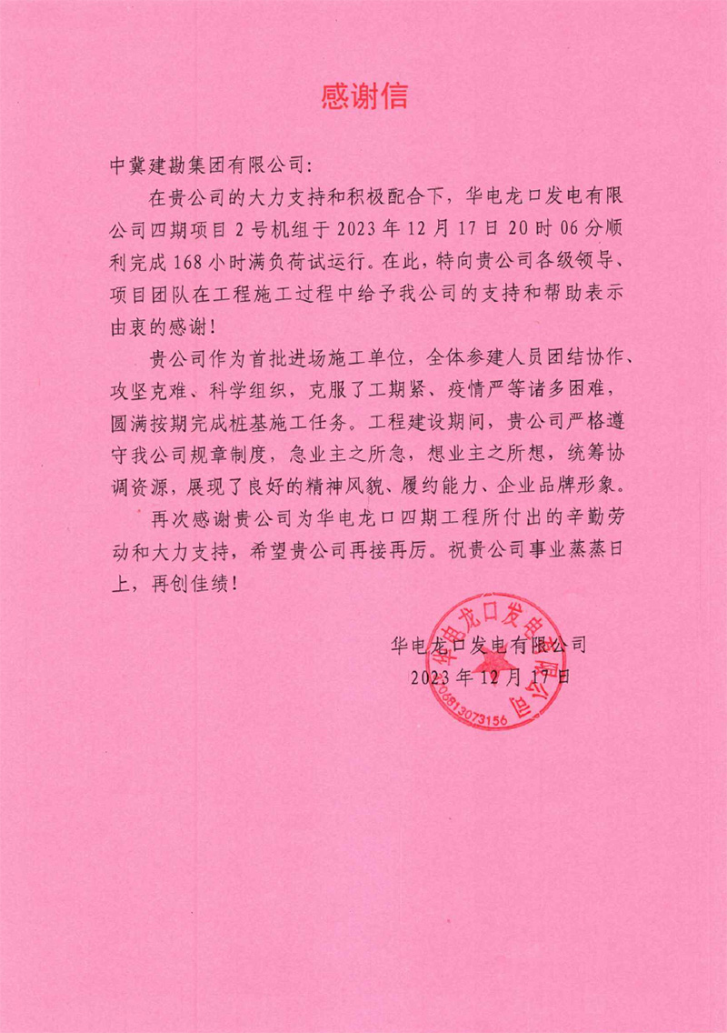 華電龍口發(fā)電有限公司四期項(xiàng)目2號(hào)機(jī)組于2023年12月17日20時(shí)04分順利完成168小時(shí)滿負(fù)荷試運(yùn)行。工程建設(shè)期間,完成了各項(xiàng)安健環(huán)活動(dòng),并在安全管理方面取得良好的效果,贏得了業(yè)主方認(rèn)可。我公司人員嚴(yán)格遵守我公司規(guī)章制度,急業(yè)主之所急,想業(yè)主之所想,統(tǒng)籌協(xié)調(diào)資源,展現(xiàn)了良好的精神風(fēng)貌、履約能力、企業(yè)品牌形象。為此,業(yè)主特向我公司各級(jí)領(lǐng)導(dǎo)、項(xiàng)目團(tuán)隊(duì)在工程施工過(guò)程中給予的支持和幫助表示由衷感謝。
