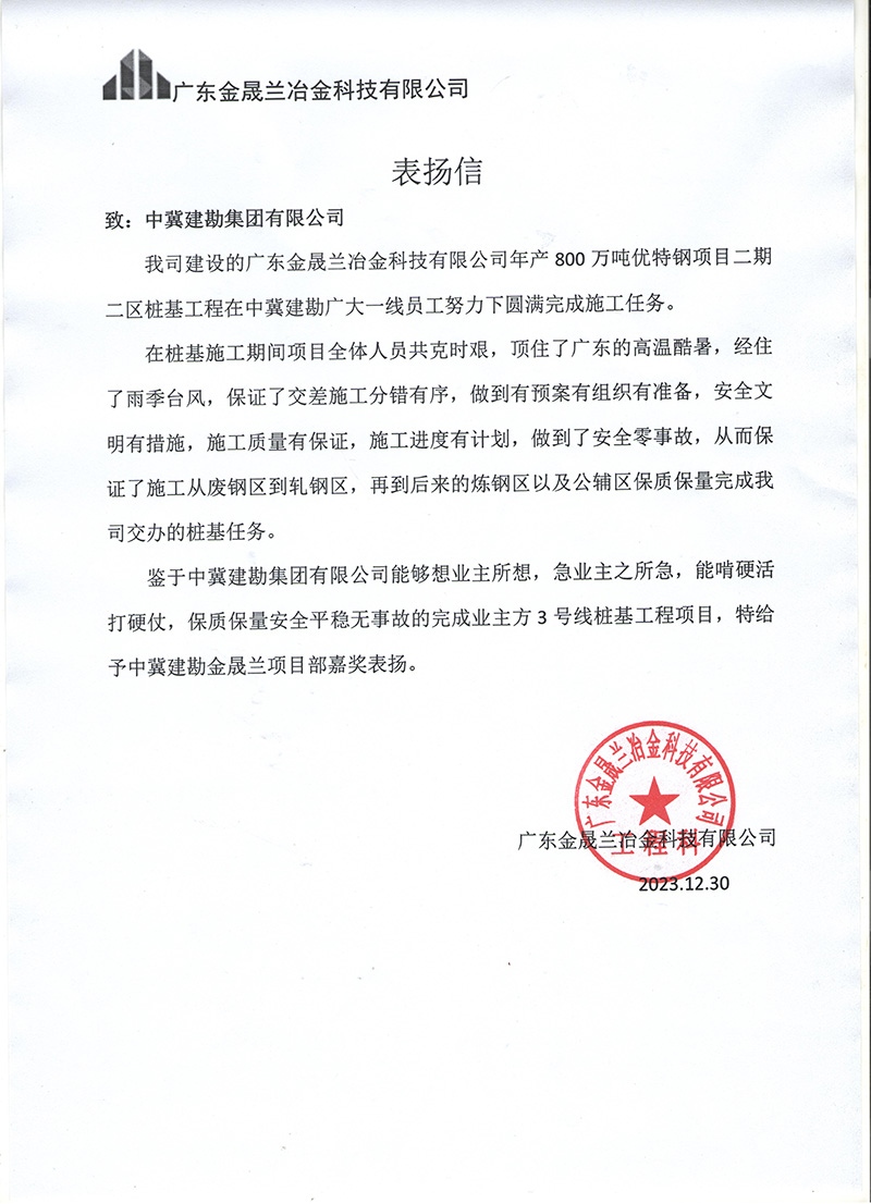 廣東金盛蘭冶金科技有限公司年產(chǎn)800萬(wàn)噸優(yōu)特鋼項(xiàng)目二期二區(qū)樁基工程,在施工期間項(xiàng)目全體人員共克時(shí)艱,頂住了廣東的高溫酷暑,經(jīng)住了雨季臺(tái)風(fēng),保證了交差施工分錯(cuò)有序,做到了預(yù)案有組織有準(zhǔn)備,安全文明有措施,施工質(zhì)量有保證,施工進(jìn)度有計(jì)劃,做到了安全零事故,保質(zhì)保量的完成任務(wù),業(yè)主對(duì)項(xiàng)目給予嘉獎(jiǎng)表?yè)P(yáng)。