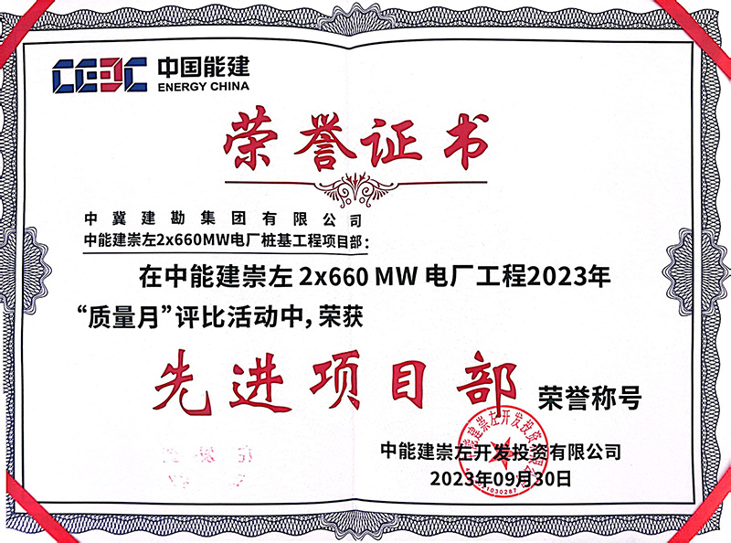 中能建崇左2×660MW電廠樁基工程,在施工過(guò)程中,項(xiàng)目部統(tǒng)一思想、統(tǒng)一步調(diào)、科學(xué)組織,精心部署,嚴(yán)格按照施工技術(shù)步驟與措施施工,層層落實(shí)安全,環(huán)環(huán)緊扣質(zhì)量,加大設(shè)備、人員投入,全力以赴做好各項(xiàng)工作。全體員工以頑強(qiáng)拼搏的施工風(fēng)范和服務(wù)業(yè)主的理念給我公司留下了深刻印象,贏得了業(yè)主及各方的高度稱贊。