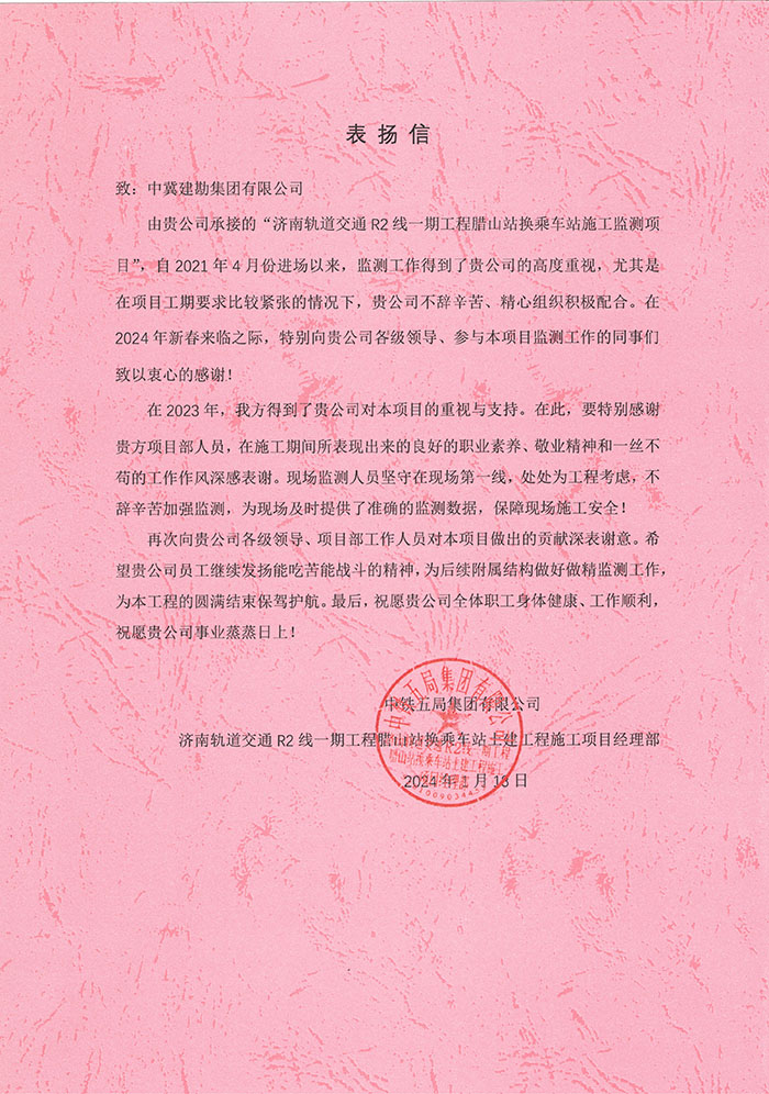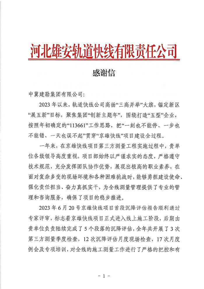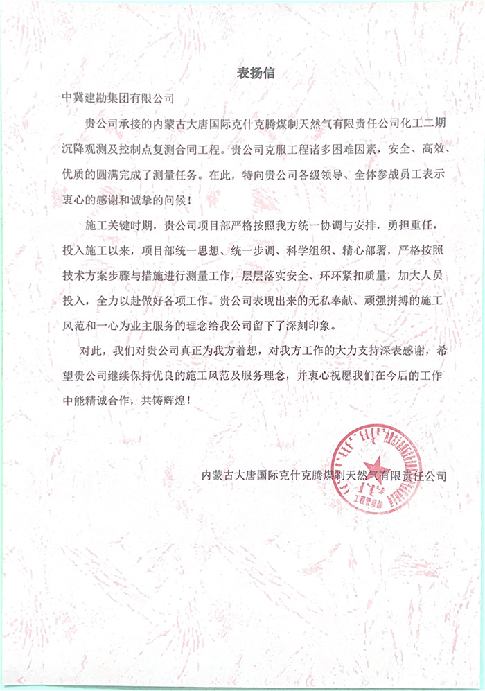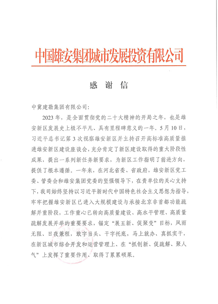 近期,公司陸續(xù)收到中國(guó)雄安集團(tuán)城市發(fā)展投資有限公司、河北雄安軌道快線有限責(zé)任公司、中國(guó)雄安集團(tuán)生態(tài)建設(shè)投資有限公司、中鐵五局、中鐵十七局、鄭州地鐵集團(tuán)、內(nèi)蒙古大唐國(guó)際克什克騰旗煤制天然氣電廠、大唐內(nèi)蒙古多倫電廠等業(yè)主單位發(fā)來(lái)的感謝信。我公司認(rèn)真負(fù)責(zé)、敢打能打硬仗的工作態(tài)度、頑強(qiáng)拼搏的施工風(fēng)范和一心為業(yè)主服務(wù)的理念,贏得了業(yè)主的高度認(rèn)可和贊揚(yáng),特發(fā)來(lái)感謝信深表感謝!