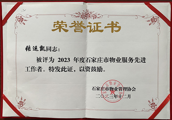 中冀建勘物業(yè)服務有限公司榮獲“2023 年度石家莊市物業(yè)管理先進單位”和“2023年度石家莊市物業(yè)服務先進單位”兩項榮譽稱號,張運凱同志榮獲“物業(yè)服務先進工作者”榮譽稱號。