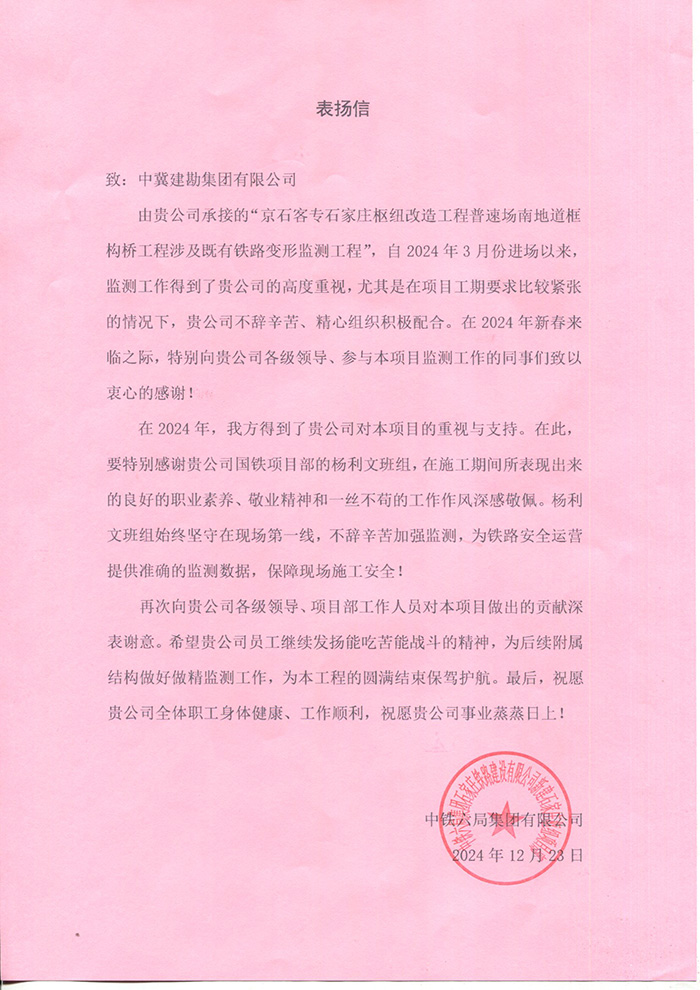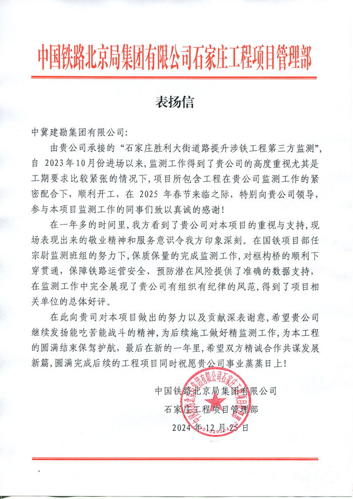 石家莊市勝利大街道路提升涉鐵工程鐵路設(shè)施安全監(jiān)測(cè)項(xiàng)目,六公司通過(guò)高精度的測(cè)繪和實(shí)時(shí)監(jiān)測(cè),確保了鐵路設(shè)施的安全運(yùn)營(yíng),贏得了中國(guó)鐵路北京局的高度評(píng)價(jià)。京石客專石家莊樞紐改造工程,我們的精準(zhǔn)監(jiān)測(cè)工作為工程的順利進(jìn)行提供了堅(jiān)實(shí)的數(shù)據(jù)支持,獲得了中鐵六局的高度認(rèn)可和表?yè)P(yáng)。