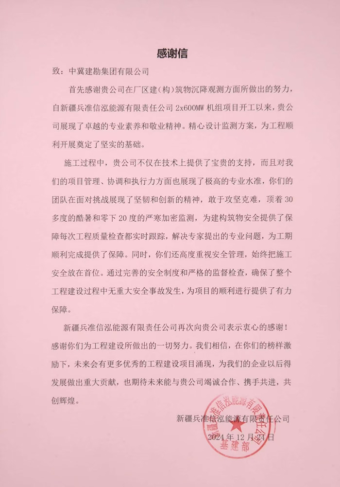 新疆昌吉兵準(zhǔn)信泓能源2x600MW機(jī)組沉降觀測(cè)項(xiàng)目,新疆項(xiàng)目部職工不畏嚴(yán)寒酷暑,頂著30多度的酷暑和零下20多度的極冷天氣加密監(jiān)測(cè),為廠區(qū)建構(gòu)筑物安全提供了數(shù)據(jù)保障,每次工程質(zhì)量檢查都實(shí)時(shí)跟蹤,解決專家提出的專業(yè)問(wèn)題,為工期順利完成提供了保障。業(yè)主單位特發(fā)來(lái)感謝信深表感謝!