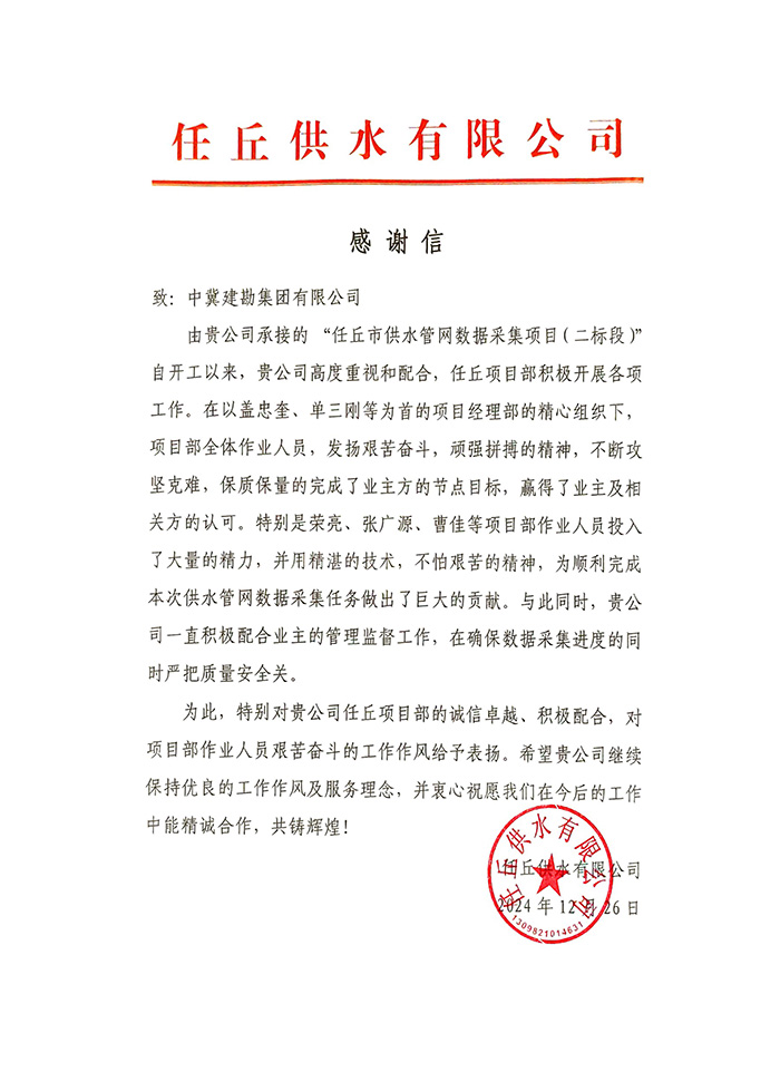任丘市供水管網(wǎng)數(shù)據(jù)采集(二標(biāo)段)項(xiàng)目,自開(kāi)工以來(lái)領(lǐng)導(dǎo)十分重視,統(tǒng)籌安排,精心組織,項(xiàng)目部全體作業(yè)人員發(fā)揚(yáng)艱苦奮斗,頑強(qiáng)拼搏的精神,不斷攻堅(jiān)克難,保質(zhì)保量順利完成了供水管網(wǎng)數(shù)據(jù)采集項(xiàng)目。我公司認(rèn)真負(fù)責(zé)、誠(chéng)信卓越、一心為業(yè)主服務(wù)的工作精神贏得了業(yè)主的高度認(rèn)可和贊揚(yáng),同時(shí)對(duì)本項(xiàng)目表現(xiàn)突出的工作人員頒發(fā)了“2024年度先進(jìn)工作者”榮譽(yù)證書(shū)。