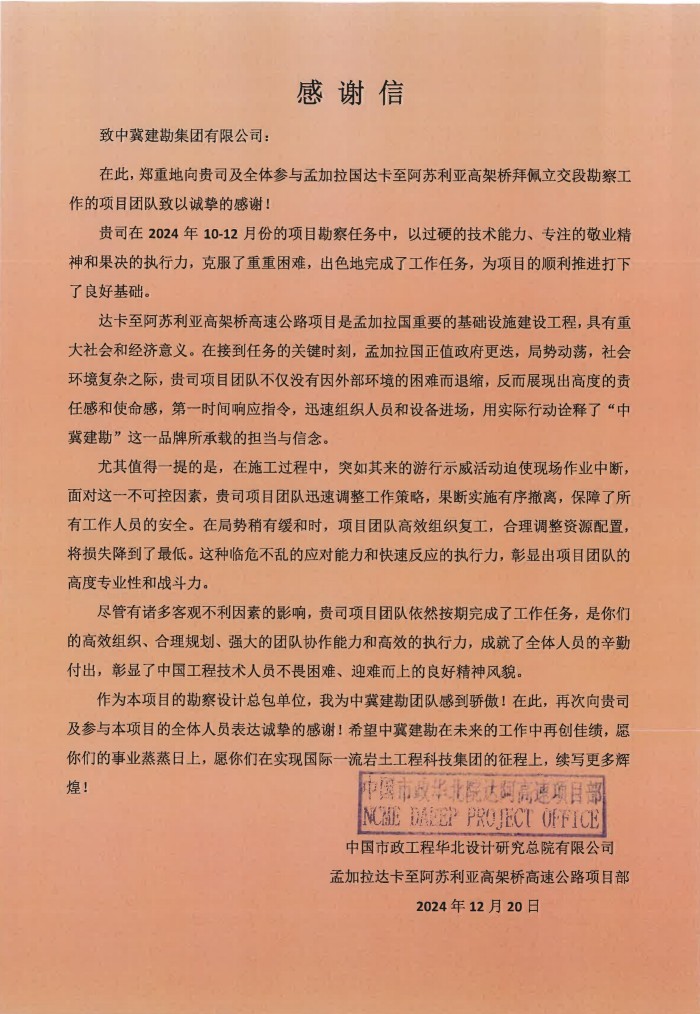 孟加拉達卡至阿蘇利亞高架橋高速公路項目部向我公司發(fā)來了感謝信,感謝我公司在項目勘察期間展現(xiàn)的高度專業(yè)精神和卓越執(zhí)行力。尤其在復雜的社會環(huán)境和突如其來的示威活動中,我公司項目團隊臨危不亂,迅速調(diào)整工作策略,保障了項目的順利推進和人員的安全。