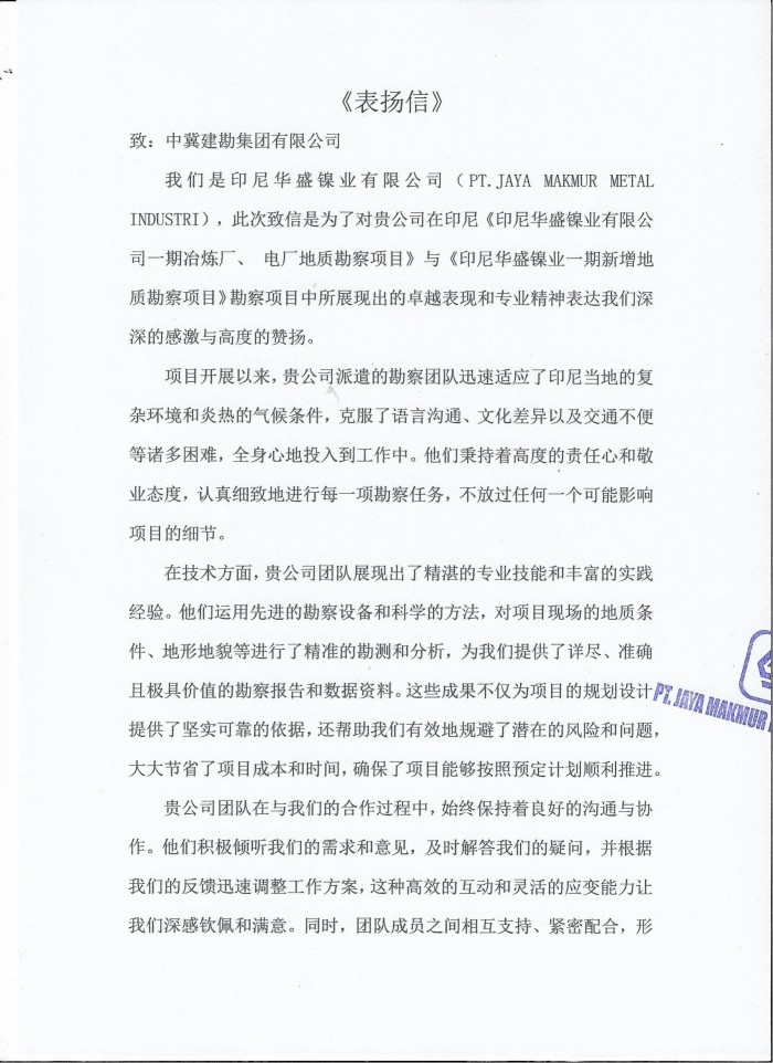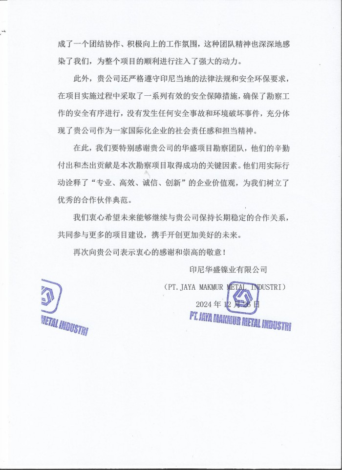 印尼華盛鎳業(yè)有限公司發(fā)來了表揚信。在印尼華盛鎳業(yè)有限公司一期冶煉廠、電廠地質(zhì)勘察項目及印尼華盛-年產(chǎn)200萬噸綜合鋼鐵項目的勘察任務(wù)中,印尼華盛勘察項目部全體職工迅速適應(yīng)印尼當?shù)氐膹碗s環(huán)境和炎熱的氣候條件,克服了語言溝通、文化差異以及交通不便等諸多困難,全身心地投入到工作中。在項目實施過程中,嚴格遵守印尼當?shù)氐姆煞ㄒ?guī)和安全環(huán)保要求,采取了一系列有效的安全保障措施,確保了勘察工作的安全有序進行。這種高度的專業(yè)素養(yǎng)和社會責任感,贏得了業(yè)主方的高度贊揚和深深感激。