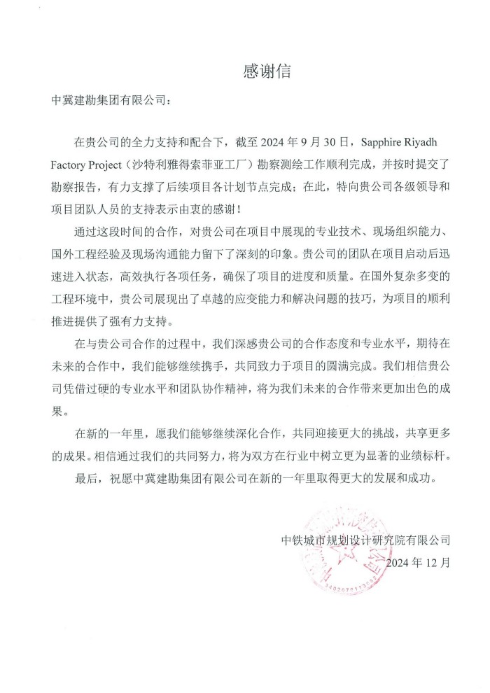 中鐵城市規(guī)劃設(shè)計研究院有限公司發(fā)來表揚信,對在我公司全力支持和配合下,順利完成沙特利亞德索菲亞工廠勘察測繪工作,并按時提交了勘察報告,有力支撐了后續(xù)項目各計劃節(jié)點完成,向我公司及項目團隊表示由衷感謝。