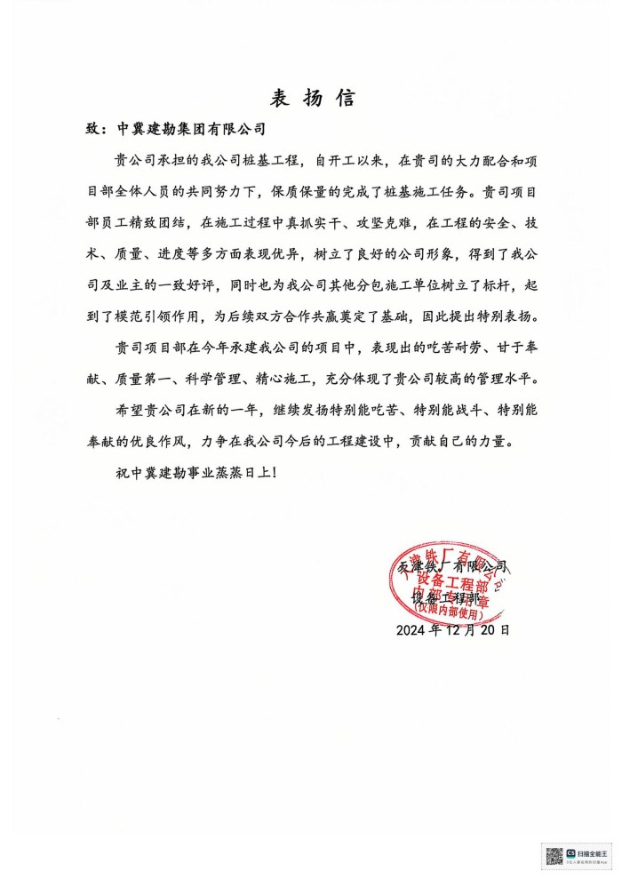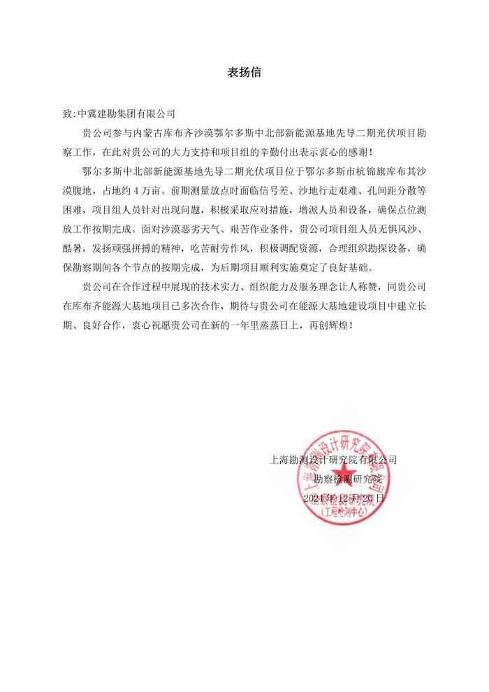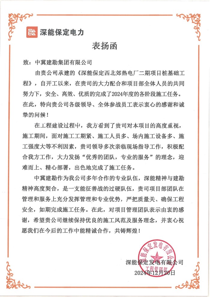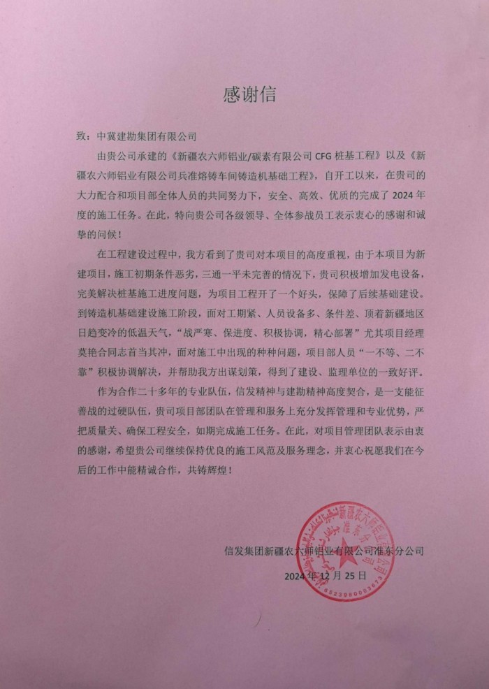 此外,我公司參與的新疆農(nóng)六師鋁業(yè)CFG樁項目、內(nèi)蒙古庫布齊沙漠鄂爾多斯中北部新能源基地光伏項目、深能保定西北郊熱電廠樁基礎(chǔ)工程等多個國內(nèi)外項目收到業(yè)主單位表揚信,對我公司在項目中的高效執(zhí)行、嚴謹管理和出色的團隊協(xié)作表示衷心感謝,并希望未來繼續(xù)與我公司保持緊密合作。