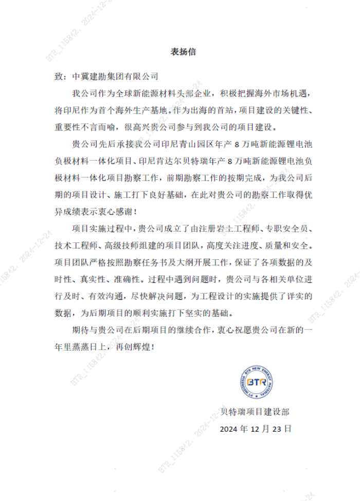 近日,公司收到了來自多方業(yè)主單位的感謝信及表揚信,表彰公司在孟加拉、印尼、沙特及國內(nèi)多個重要項目中,展現(xiàn)出的卓越項目管理能力、技術(shù)實力、團隊協(xié)作及不懈努力。各業(yè)主單位對公司在工程勘察、施工管理、技術(shù)方案執(zhí)行、質(zhì)量控制和安全生產(chǎn)等方面給予了較高認可,并送上了誠摯的祝福。
