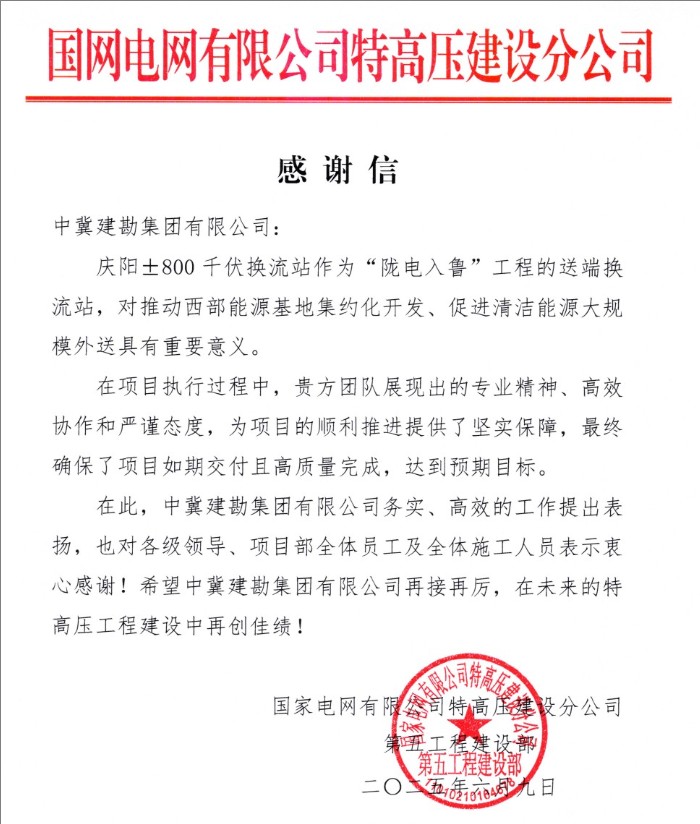 2025年6月9日,在±800千伏隴東-山東特高壓直流工程(簡稱“隴電入魯”)正式投運之際,我公司收到國家電網(wǎng)有限公司特高壓建設分公司對慶陽±800千伏換流站項目發(fā)來的感謝信。信中高度贊揚了我公司在項目執(zhí)行過程中展現(xiàn)出的卓越專業(yè)精神、高效協(xié)作能力和嚴謹工作態(tài)度。