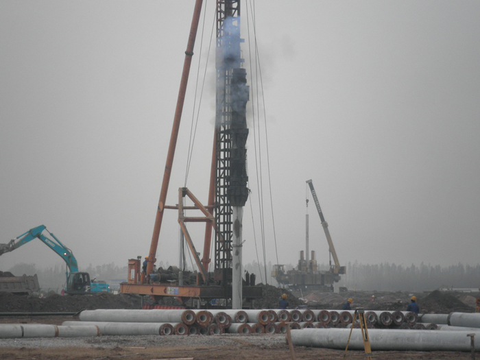 本工程我公司共完成樁徑Φ400mm、樁長18~27m的PHC管樁601根,共計(jì)約14976延米;樁徑Φ500mm、樁長23~32m的PHC管樁826根,共計(jì)約22039延米;樁徑Φ400mm、樁長15.6~21.6m的CFG樁537根,理論方量1360m3,實(shí)際方量為2029m3。