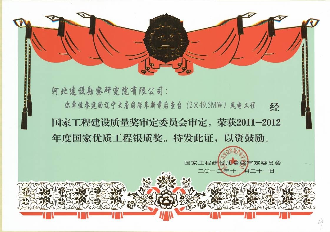 由我公司參與施工的遼寧大唐國際阜新前后查臺(2×49.5MW)風電工程被國家工程建設質量獎評定委員會評定為2011-2012年度“國家優(yōu)質工程銀質獎”。