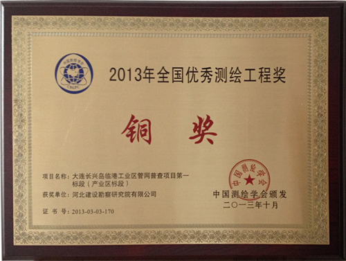 近日,由我公司完成的大連長(zhǎng)興島臨港工業(yè)區(qū)管網(wǎng)普查項(xiàng)目第一標(biāo)段(產(chǎn)業(yè)區(qū)標(biāo)段)被中國(guó)測(cè)繪學(xué)會(huì)評(píng)為優(yōu)秀測(cè)繪工程銅獎(jiǎng)。